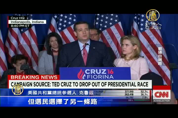 【新唐人亞太台 2016 年 05 月 04 日訊】新聞頭條,先來看到美國大選最新消息。共和黨在印第安納州舉行總統提名初選,共和黨參選人川普再次獲得勝利。川普主要的對手克魯茲,宣布退出選舉。