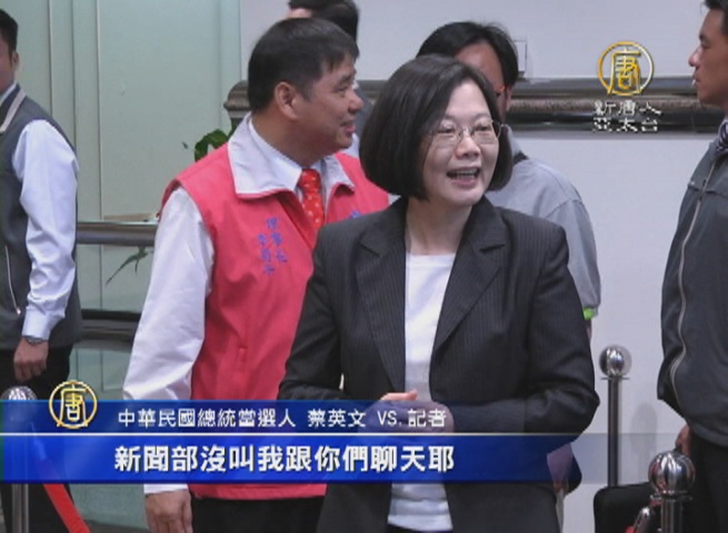 中華民國總統當選人 蔡英文VS.記者:「(主席,醫療這麼重要那WHA一定要去對不對?)(主席,男性內閣..)你們換了一個方向了。(主席有沒有發現閣員又失言了)(主席 跟我們聊一下)新聞部沒叫我跟你們聊天耶。(主席去WHA是不是承認九二共識)(主席母親節要怎麼過)你說什麼?(母親節)母親節快樂。」