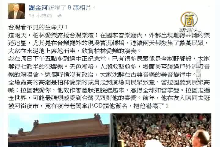 【新唐人亞太台 2016 年 05 月 10 日訊】母親節期間,享譽全球的柏林愛樂正好在台灣演出,國家音樂廳內外,數萬民眾舉家坐在戶外廣場享受動人樂音!財經專家謝金河也在臉書發文,認為民眾如此享受這場盛會,是「台灣看不見的生命力!」謝金河還透露,柏林愛樂的指揮家拉圖,前年去逛饒河街夜市,竟然有夜市老闆拿出 CD請他簽名,讓他強烈感受到台灣民眾對他的喜愛!