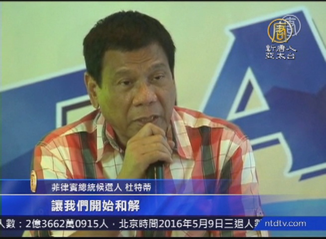 【新唐人亞太台 2016 年 05 月 10 日訊】菲律賓總統大選開票出爐,71歲杜特蒂,以壓倒性票數當選,因為爭議言行不斷,杜特蒂在投完票後,也公開表示,要與對手和解。