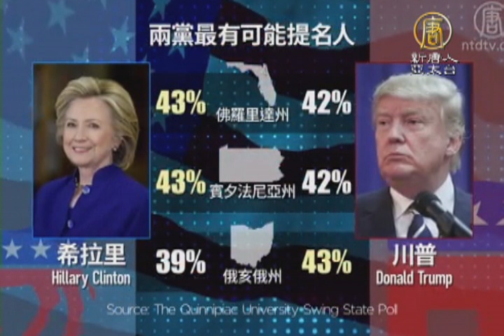 而根據昆尼派克大學在週二公佈的最新民調,希拉蕊在佛州和賓州各領先川普一個百分點,不過在俄亥俄州,川普則領先希拉里4個百分點。