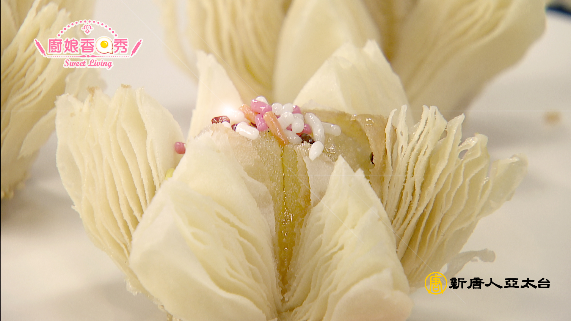 酥皮點心是一道傳統點心,酥層清晰,食之酥松香甜,別有風味。在基本操作上,造型做些改動就會生成一種新的品種。本來就在上海餐廳做點心的魏艷,和李鴻榮師傅學習的這道酥皮點心,因造型似荷花,因此被稱為荷花酥。