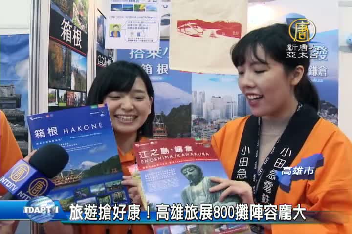 【新唐人亞太台 2016 年 05 月 14 日訊】高雄市國際旅展13日開幕,現場超過800個攤位,創新歷年紀錄,國內外好玩、好康的統統在這裡,包括國內外旅遊業者、航空公司、日本熊本縣都來搶客,預計四天展期可吸引30萬人次,帶動觀光旅遊熱潮。
