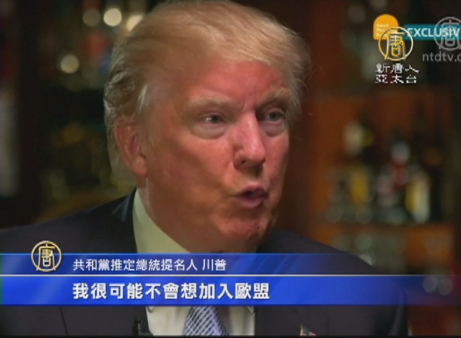 【新唐人亞太台 2016 年 05 月 17 日訊】英國脫歐公投將於6月舉行,有別於大多數國家領袖呼籲英國留在歐盟,美國共和黨總統候選人川普不改特立獨行論點,他認為,英國退出歐盟將會「更好」。