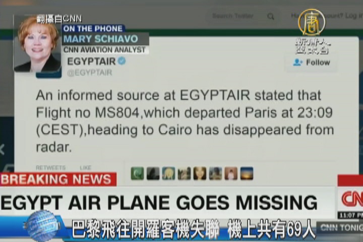 CNN主播:「埃及航空從巴黎飛往開羅的班機804目前失聯中」