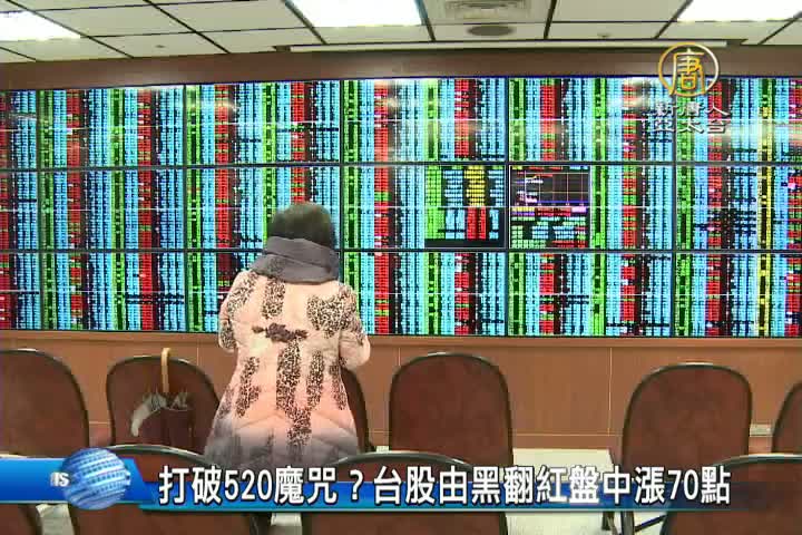 【新唐人亞太台 2016 年 05 月 20 日訊】520就職,來看股市的表現,今天台股開高後一度翻黑但隨即震盪翻紅,收復8100點,維持量縮格局,在蔡英文總統就職演說結束後,台股行情向上走高,漲了70點,權值股包括台積電、台化、台泥、中鋼、統一等都上漲,科技股多數由黑翻紅,但能否擺脫過去四次新總統就職520當天,股市跌多漲少的520魔咒,各界持續關注。