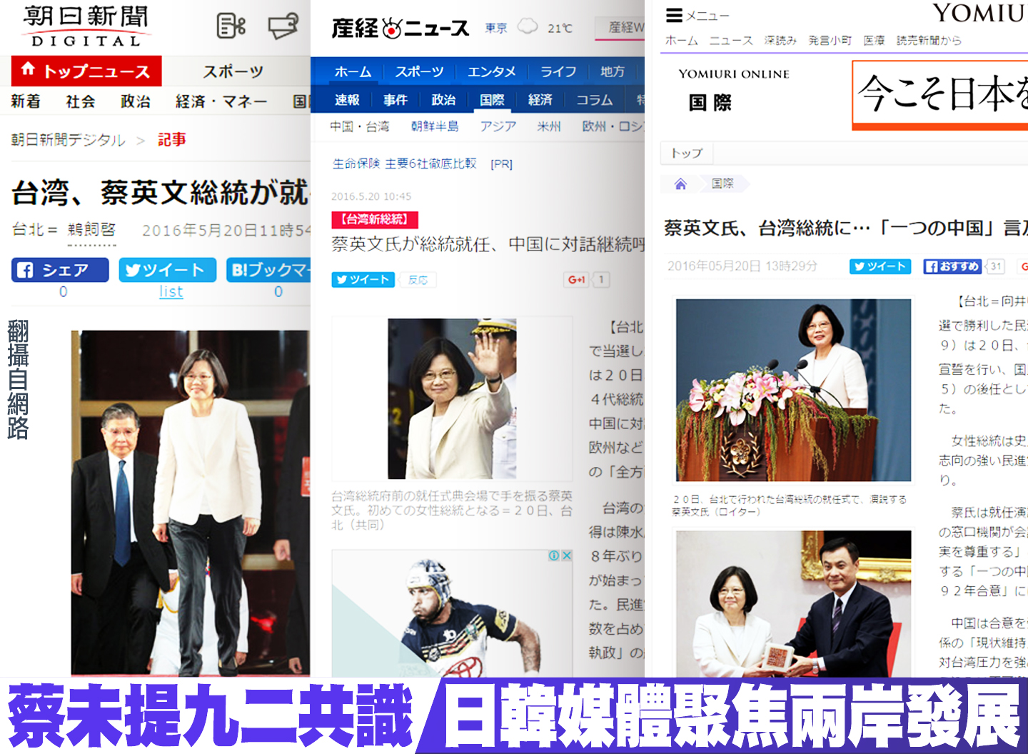 蔡未提九二共識 日韓媒體聚焦兩岸發展
