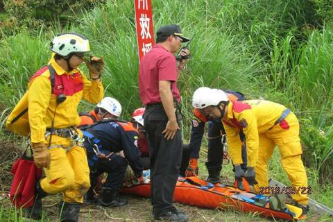 搜救人員把受難者抬上擔架固定,準備運送。(臺南市消防局第二大隊提供)