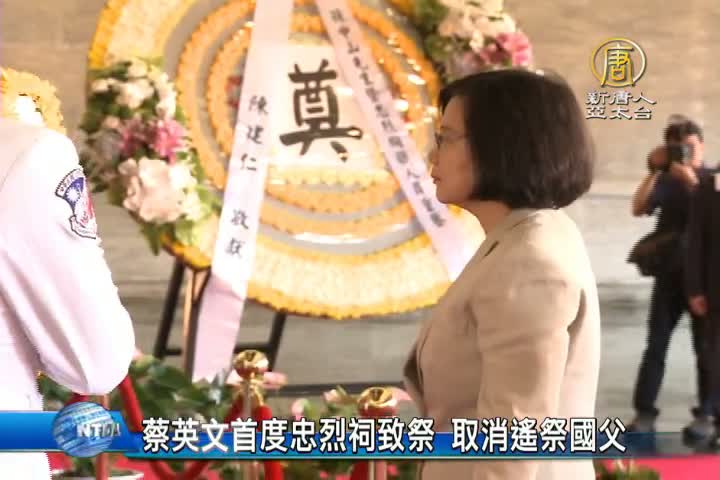 【新唐人亞太台 2016 年 05 月 23 日訊】蔡英文上任總統之後,今天(23)首次前往忠烈祠,祭祀革命先烈與國父,同時也取消過去「遙祭國父陵」的儀式,總統府方面表示,因應民主時代,取消封建儀式。