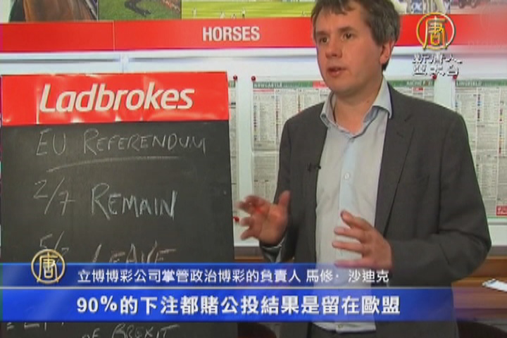 【新唐人亞太台 2016 年 05 月 23 日訊】英國距離舉行是否留在歐盟的公投,只剩一個月的時間,雖然民調顯示,留在歐盟和脫離歐盟的兩派支持率不相上下,不過,倫敦博彩公司預測,留歐會遠大於脫歐。