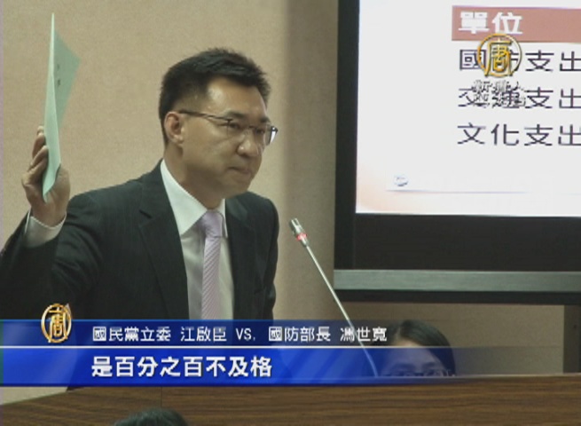 國民黨立委 江啟臣 VS. 國防部長 馮世寬:「我如果叫它業務報告、書面報告的話,是百分之百不及格。弊案調查也沒有提,軍事採購的費用也沒有提,共諜的防範也沒有提。請問部長,現在有多少國防部重要優先法案待在立法院沒有審?這個我不知道。你不知道?」