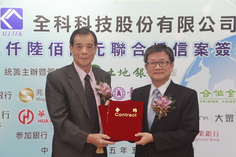 【新唐人亞太台 2016 年 05 月 27 日訊】土地銀行統籌主辦全科科技股份有限公司總金額美元9,600萬元聯貸案,已成功完成募集,並於105年5月27日舉行簽約儀式,由土地銀行吳當傑董事長代表銀行團與全科科技股份有限公司王木聰董事長簽訂聯合授信合約。