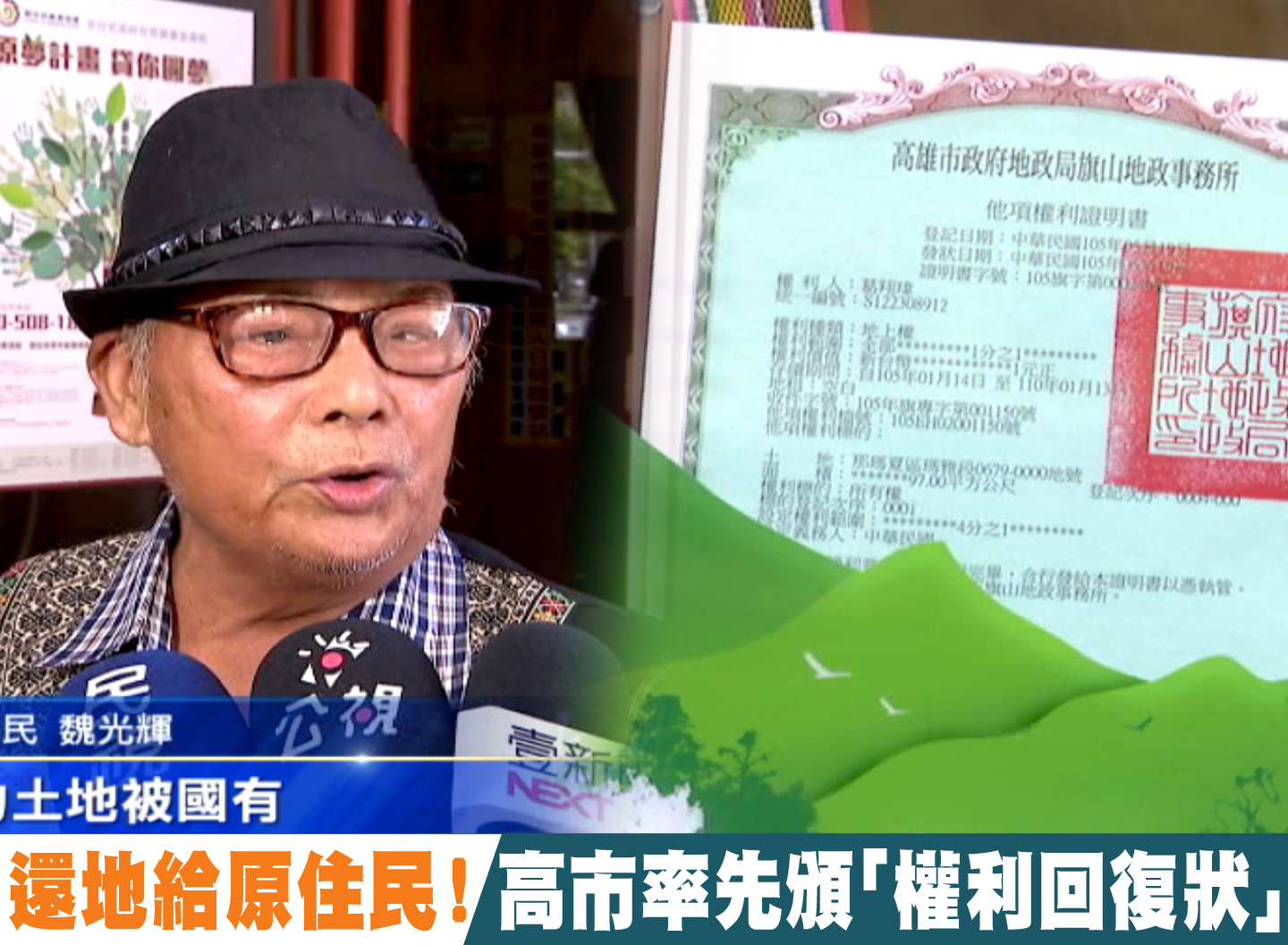 高雄市長陳菊親自頒發「原住民保留地權利回復狀」,給60位原住民,有了這張土地權狀之後,未來原住民就能自由買賣、耕作,就像是個人財產一樣。