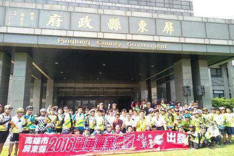 參加單車畢業典禮的300位小朋友今早從屏東縣政府出發,將騎120公里直奔鵝鑾鼻。(屏東縣政府提供)