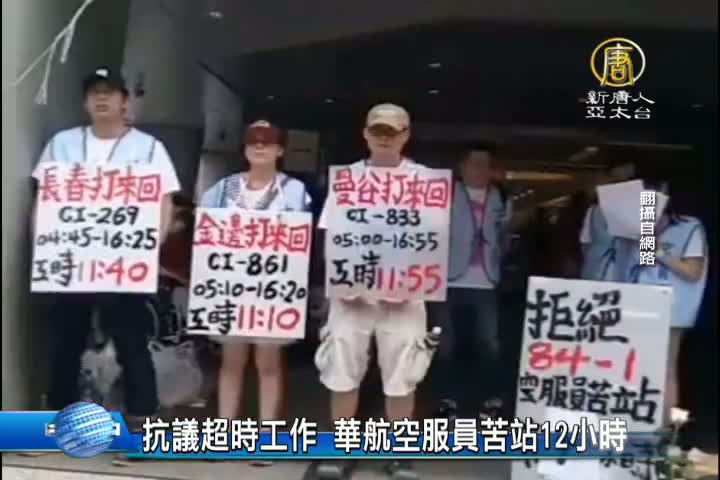 【新唐人亞太台 2016 年 05 月 31 日訊】為了抗議華航空服員的超時工作,從今天清晨4點起, 3位空服員在華航台北分公司門口前,開始苦站12小時,另外在下午1點半,華航的空勤、地勤人員以及聲援的勞工團體代表,預計有上千人也將到交通部陳情,接著步行到華航台北分公司抗議,要求華航解決超時工作、薪資不合理及6月改到桃園報到的新規定,否則下一步將發起罷工投票。