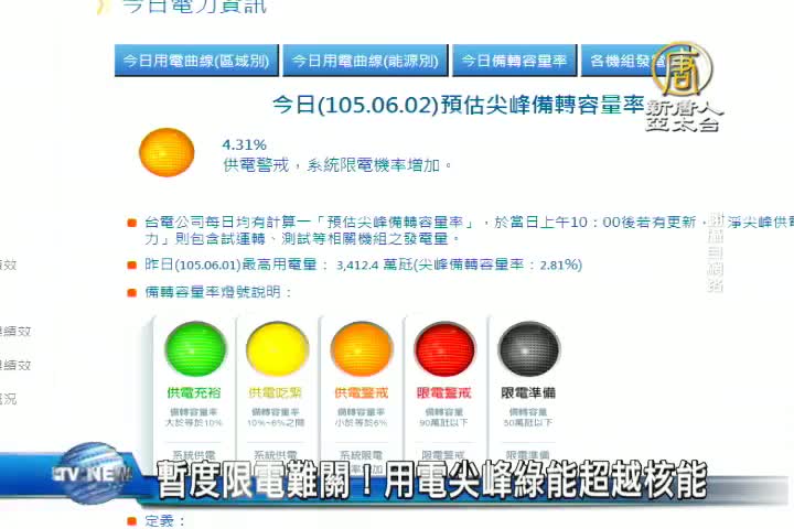 【新唐人亞太台 2016 年 06 月 02 日訊】歡迎回來,昨天全台熱翻,夏季電價起跑;不過,從資料來看,用電尖峰比前天少了大約30萬瓩,平面媒體報導,台電透過 需量競價、緊急採購 汽電共生餘電的方法,暫時度過限電難關,而且,昨天用電尖峰時刻,綠能發電量首次超過核電,消息也受到環保團體肯定。