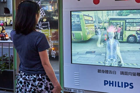 【新唐人亞太台 2016 年 06 月 02 日訊】人臉辨識、4D技術超夯,免到科技展場,在台北街頭等公車就能親身體驗!長期致力於健康科技領域創新的飛利浦,大玩創意搭建4D戶外數位互動廣告,結合人臉辨識高科技與包含嗅覺、觸覺及聽覺的4D互動情境,搭配時下健康議題,於微風南京旁、敦化北路上打造會說話的「聽身體告白」公車站。透過創意溝通,提醒民眾仔細聆聽身體警訊、反思生活方式是否健康,並從日常生活中針對飲食、呼吸、頭皮、牙齒及肌肉酸痛等,做到預防勝於治療。