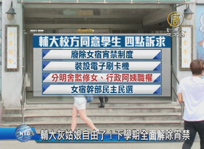 【新唐人亞太台 2016 年 06 月 02 日訊】輔大學生爭取女宿解除宵禁,發起絕食抗議進入第四天,校方態度軟化,經過校務會議投票表決,決定從下學期開始,全面解除女宿宵禁,校方也同意學生提出的四項訴求,其中包括宿舍幹部直選,落實學生自治。