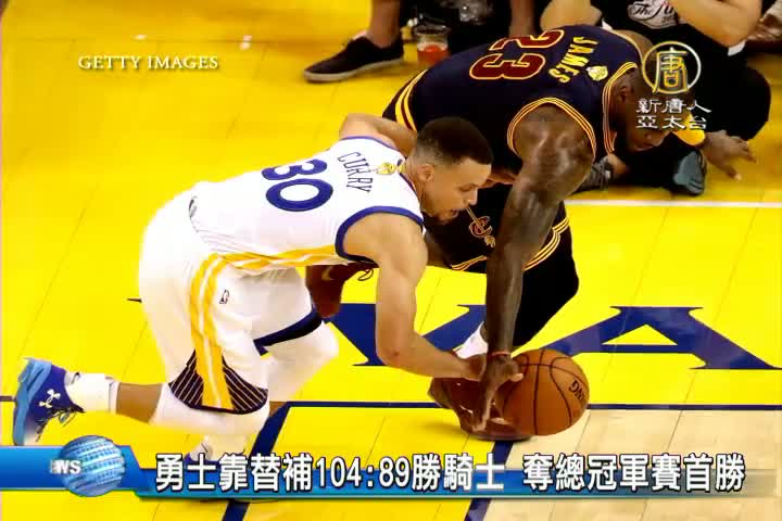 【新唐人亞太台 2016 年 06 月 03 日訊】歡迎回來,NBA總冠軍賽重演去年勇士與騎士對決戲碼,今天系列賽第一戰,衛冕軍勇士隊「浪花兄弟」柯瑞和湯普森,遭到騎士隊封鎖,兩人總共只拿下 20分,但靠著勇士替補大爆發,合計貢獻45分,完全壓過騎士替補的10分,終場勇士以 104:89 擊敗騎士,系列賽取得1:0領先。