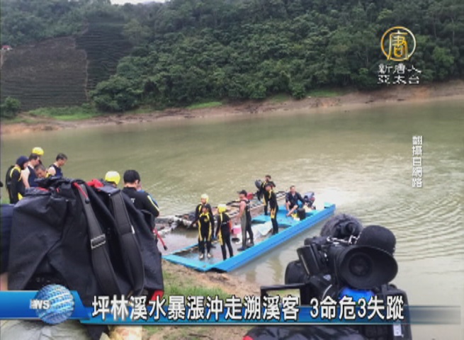 【新唐人亞太台 2016 年 06 月 05 日訊】新北市坪林區北宜公路約40公里處的中牛寮溪,今天下午1點左右,驚傳有8人被暴漲的溪水沖走,新北消防局獲報,出動大批人力及車輛前往現場救援,目前救起的5人,其中有3人無生命跡象送醫,另有3人失蹤。據了解,這八個人,有六位是成年人,2名青少年。他們是台北粉鳥客溯溪團的成員。新北消防局派遣3個大隊人員前往救援,空勤直升機也出發前往搜救。