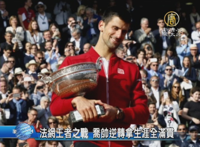 【新唐人亞太台 2016 年 06 月 06 日訊】歡迎回來,法網男單王者之戰,今天凌晨揭曉!球王喬柯維奇5年內第4度打入法網男單決賽,今天以3比6、6比1、6比2、6比4逆轉擊敗「英國希望」莫瑞。喬柯維奇是在先失首盤後,連追三盤,成功拿下首座法網冠軍盃,也成為史上第8位達成生涯全滿貫的男網選手。喬帥確定獲勝後,倒在紅土上,他賽後感動的說:「我的家庭、我的團隊和我的愛人,感謝妳們對我的容忍,感謝你們願意以我想要的方式去處理事情,這是我職業生涯最特別的時刻!」