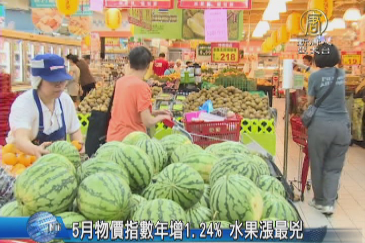 【新唐人亞太台 2016 年 06 月 07 日訊】主計總處公布5月消費者物價指數,年增1.24%。其中水果漲幅達31.18%,是123個月以來最大漲幅,等於平均每戶家庭5月單水果消費,多支出432元。蔬菜、水果受天候不穩影響,價格上漲了2到3成,所幸能源類價格調降,抵銷部分支出。整體觀察,物價漲幅還算溫和穩定。