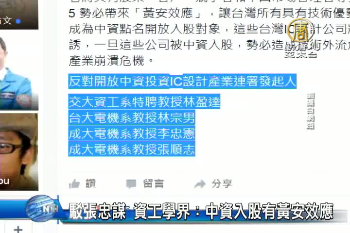 【新唐人亞太台 2016 年 06 月 07 日訊】台積電董事長張忠謀在股東會上說,同意中資入主台灣IC設計,但投資者不能進董事會。對此,成大電機系教授李忠憲等資工學者,今天發表聯合聲明,反對「中資入股台灣IC設計產業」。聲明說,中資不必然在董事會或經理階層才能搬走技術,因為它將具有股東、客戶、競爭者和中國市場管理者等多重角色。聲明強調,如果讓中資入股將會有「黃安效應」,優勢產業會一個個被點名入股,造成產業危機。