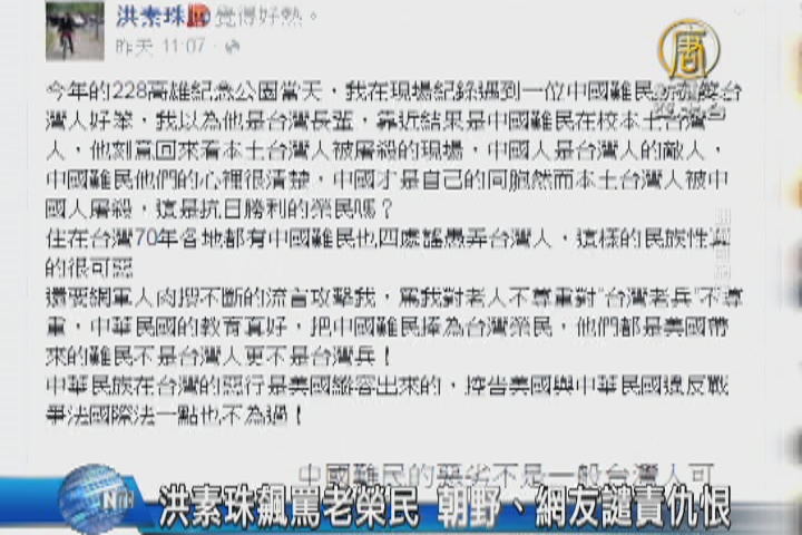 洪素珠飆罵老榮民 朝野、網友譴責仇恨