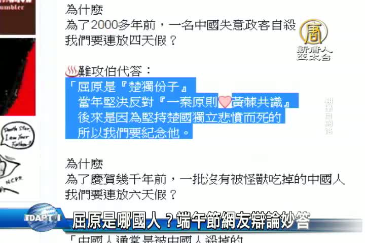 【新唐人亞太台 2016 年 06 月 10 日訊】再來看到,前主播李艷秋在臉書po文,質疑蔡政府「為什麼為了2000多年前,一名中國失意政客自殺,我們要連放四天假?」意外掀起網友對「屈原到底是哪國人」的激辯。