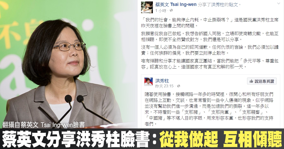 蔡英文分享洪秀柱臉書:從我做起 互相傾聽