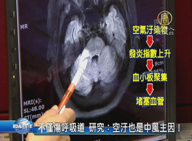 【新唐人亞太台 2016 年 06 月 11 日訊】空氣汙染不僅是呼吸道疾病的殺手,現在國外最新研究指出,空汙也是導致中風主因之一。神經內科醫師表示,吸入過多空氣中的懸浮微粒,容易引發發炎指數上升,造成動脈硬化,而且根據資料顯示,空汙引發腦中風的機率,更是呼吸道疾病的3~4倍。