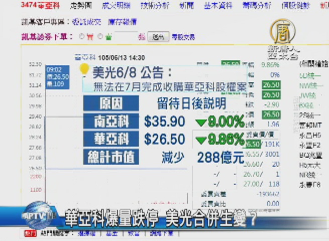 去年年底才敲定美光與華亞科的合併收購案,卻沒想到美光6月8號宣布,無法在預定時間7月內完成收購案,原因卻不明,重大利空影響下,母公司南亞科重跌9%,華亞科一開盤就直奔跌停,跌幅9.86%,兩家公司一天市值就縮水288億元。