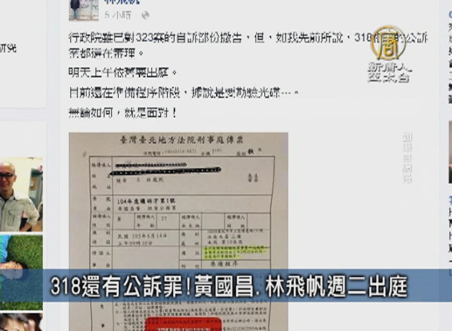 新政府雖然撤回在太陽花學運中攻佔行政院遭控違法的126名被告的告訴案,但攻占立法院行動的相關公訴案仍在審理。林飛帆13日就在臉書貼出一張法院傳票,通知他14日出庭;時代力量立委黃國昌也隨即轉貼林的貼文,並寫下「如同飛帆所言,勇敢面對318的司法程序」。