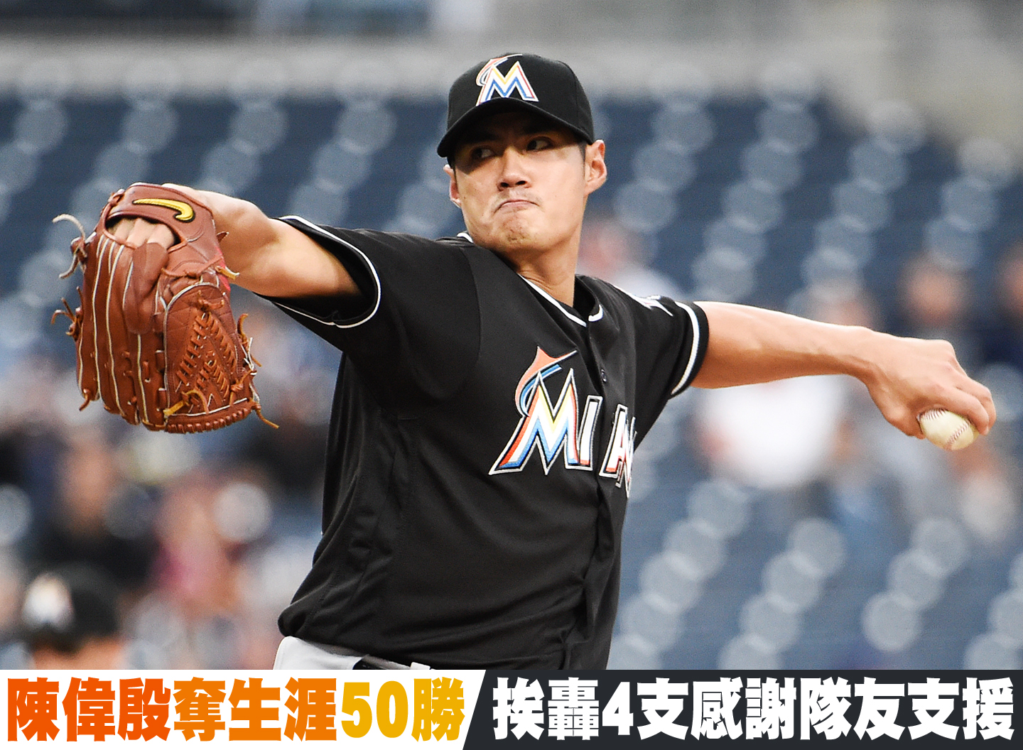 【新唐人亞太台 2016 年 06 月 14 日訊】歡迎回來。旅美台灣投手陳偉殷,今天終於拿下美國職棒大聯盟生涯的第50勝,效力邁阿密馬林魚隊的陳偉殷,今天對上教士隊先發6局,被打出7支安打,包括4支全壘打,失掉4分,寫下個人單場最慘紀錄,不過靠著隊友強大火力支援,最後還是以13比4擊敗教士,陳偉殷如願拿下生涯第50勝。