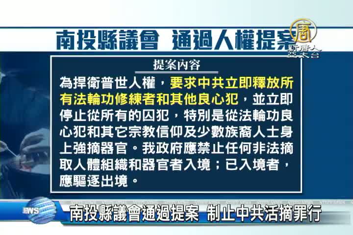 南投縣議會14日通過,由民進黨籍議員廖梓佑發起的提案,要求中共政府停止活摘器官並釋放法輪功學員,獲得包括副議長潘一全及10位跨黨籍議員共同連署附議。