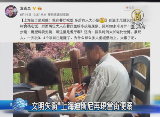 【新唐人亞太台 2016 年 06 月 18 日訊】上海迪士尼樂園,已經在6月16號開幕,吸引世界的矚目。不過就在開幕當天,就傳出不文明事件。有遊客曝光,有人在餐廳當眾給孩子便溺。這也讓大陸社會,經濟發展與文明之間的失衡,再次受到關注。