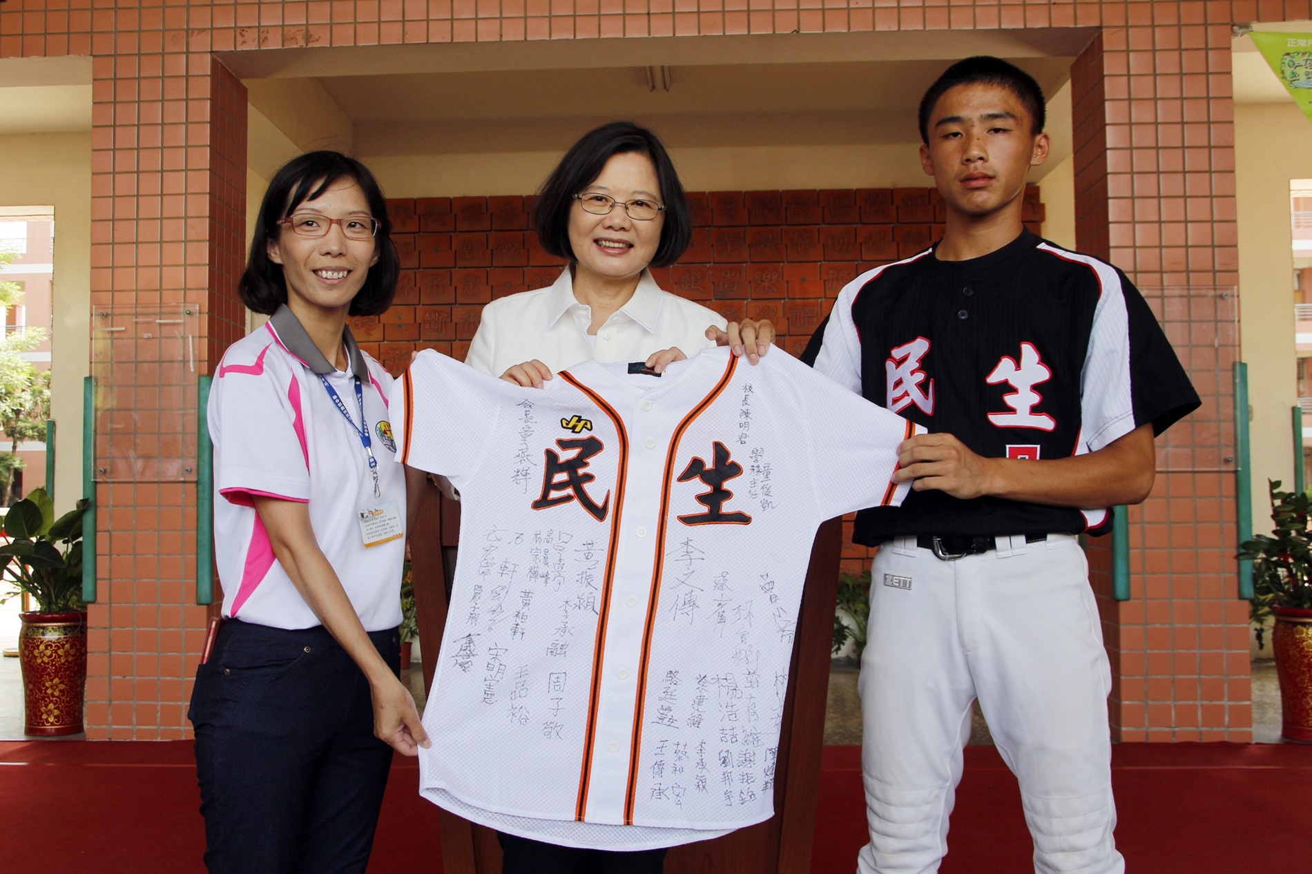 感謝嘉義市民生國中棒球小將們協助拍攝競選影片,蔡英文今贈棒球器材,而小將們就回贈球隊全員的簽名球衣。(嘉義市政府提供)