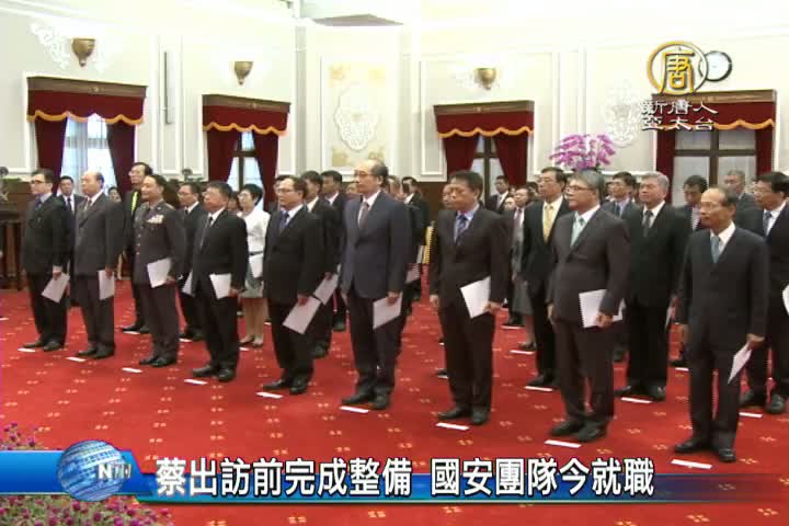 【新唐人亞太台 2016 年 06 月 20 日訊】蔡英文總統,即將在月底,進行首次的國際出訪行程。今天,國安團隊,正式宣誓就職。 包括國家安全局局長楊國強、副局長郭崇信、總統府副秘書長劉建忻、曾厚仁,國安會副秘書長陳俊麟、國防部副部長鄭德美等49人完成宣誓。蔡總統本周五就要出訪友邦巴拿馬及巴拉圭,並過境美國邁阿密及洛杉磯。啟程前,府方安排國安團隊宣誓就職,頗有特別為蔡總統首次出訪精心整備的意思。