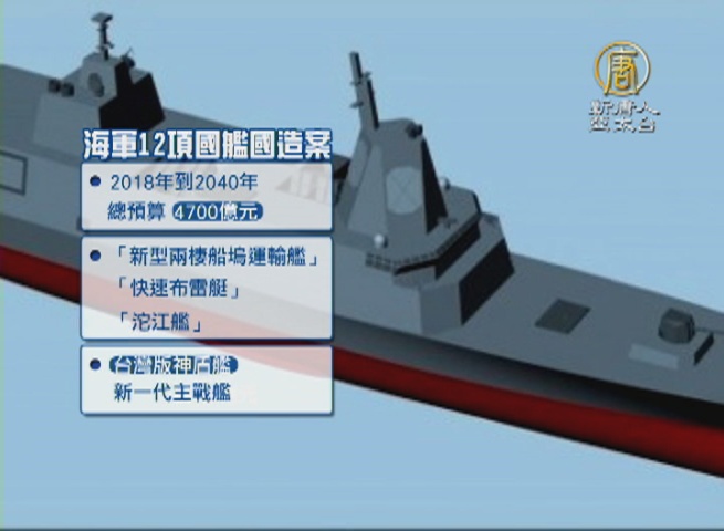 海軍公布12項國艦國造案,預定從2018年到2040年,總預算4700億元,優先項目包括「新型兩棲船塢運輸艦」、「快速布雷艇」和「沱江艦」,其中被視為「台灣版神盾艦」的新一代主戰艦,示意圖也在今天首度曝光。