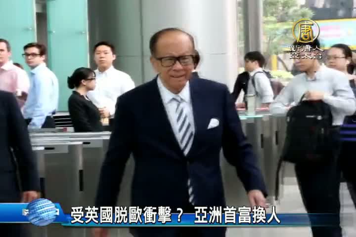 【新唐人亞太台 2016 年 06 月 20 日訊】好,那麼英國脫歐公投,近期也影響了香港首富李嘉誠旗下集團股價,因為李嘉誠近來重心轉到歐洲,脫歐公投前,李嘉誠資產縮水,創下 4 年來新低,以亞洲區域來看,李嘉誠資產現在規模,已經被中國阿里巴巴董事局主席馬雲和萬達董事長王健林超越。如果英國脫歐,英鎊貶值,李嘉誠資產賬面,將會「大縮水」。