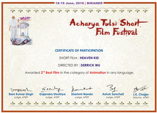 【新唐人亞太台 2016 年 06 月 21 日訊】臺灣原創動畫《天庭小子-小乾坤》(Heavenkid) ,今天再傳佳績,為臺灣摘下印度 阿察利亞圖希 短片影展(Acharya Tulsi Short Film Festival)「最佳動畫 」第二名,將於印度放映。
