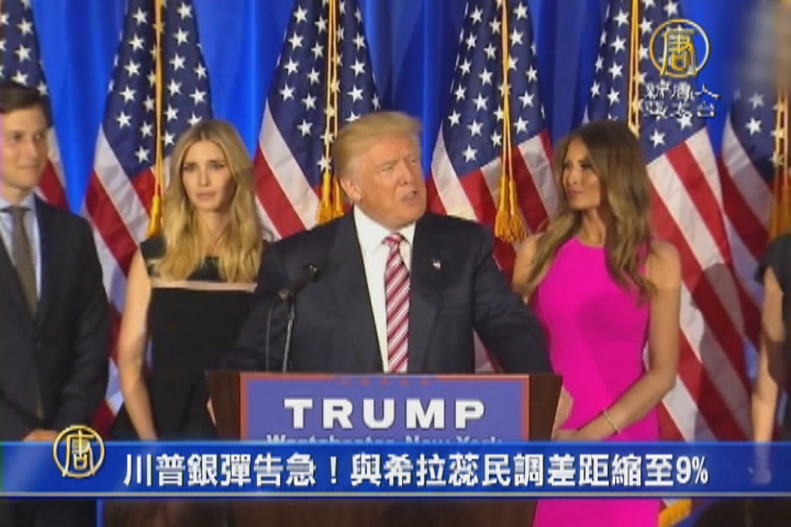 【新唐人亞太台 2016 年 06 月 22 日訊】帶您來看美國選舉消息,最新民調顯示,美國民主黨總統參選人希拉蕊柯林頓,領先對手共和黨總統參選人川普的差距,縮小到9個百分點。另外,根據聯邦選委會收到的報告,川普的競選募款只有130萬美元。創下歷來美國總統大選募款金額新低紀錄。