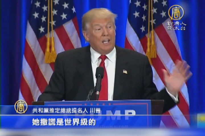 【新唐人亞太台 2016 年 06 月 23 日訊】來關心美國總統大選,共和黨總統參選人川普昨天不但抨擊對手、民主黨總統參選人希拉蕊.柯林頓是「世界級騙子」,還緊咬希拉蕊過去在貿易、外交政策和移民方面的紀錄。面對兩人日益縮小的民調差距,川普,火力全開。