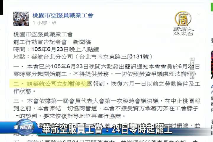 【新唐人亞太台 2016 年 06 月 23 日訊】新聞頭條先帶您關心,桃園市空服員職業工會今天傍晚突然宣布,華航空服員從明天零時起開始罷工,罷工地點在華航台北分公司門口,工會發出了八項聲明,包括要求華航立刻暫停桃園報到的措施,恢復6月1日前的勞動條件等,工會並在晚間8點舉行記者會,宣讀罷工宣言,稍後前線有更多消息,我們會為您即時關注。