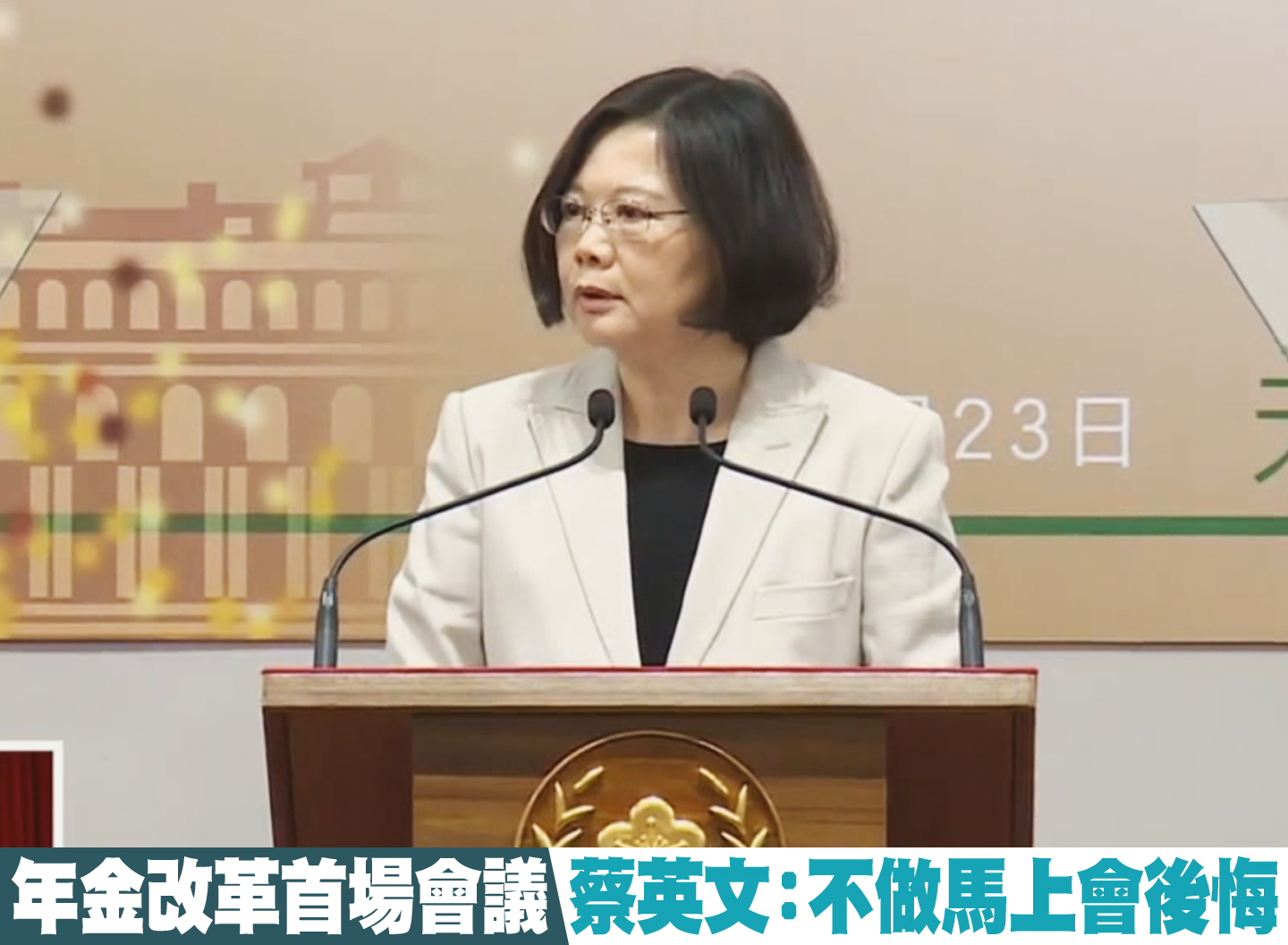 中華民國總統 蔡英文:「新政府的年金制度改革會議,今天正式揭開序幕了。有些改革是,現在不做 以後會後悔,不過年金制度的改革,已經急迫到,現在不做 馬上就會後悔。」