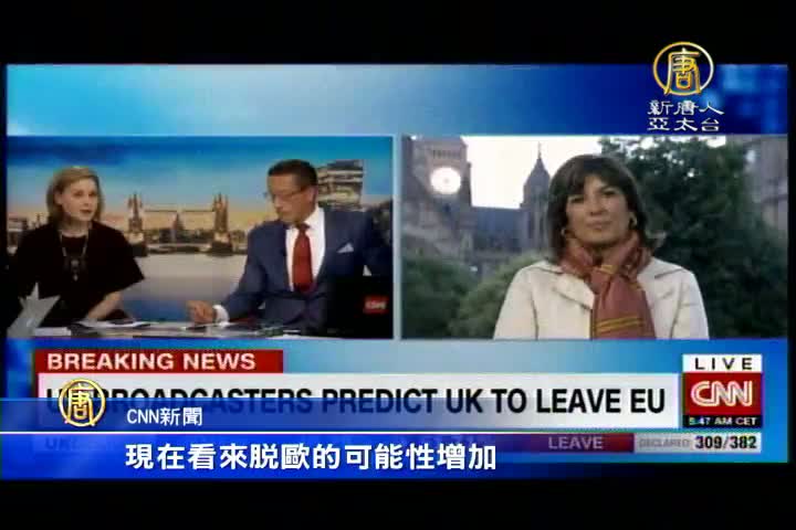 【新唐人亞太台 2016 年 06 月 24 日訊】英國脫歐公投計票與開票作業,從台灣時間早上5點開始進行,目前已開出325個選區,脫歐派拿到1409萬票,留歐派 1316萬票,差距達93萬票。得票率脫歐派是52%,勝過留歐派的48%。目前英國時間差不多是週五凌晨5點多,大概再一個多小時,就完成全部開票,目前包括BBC、CNN的報導,都傾向認為脫歐派,可能勝出。