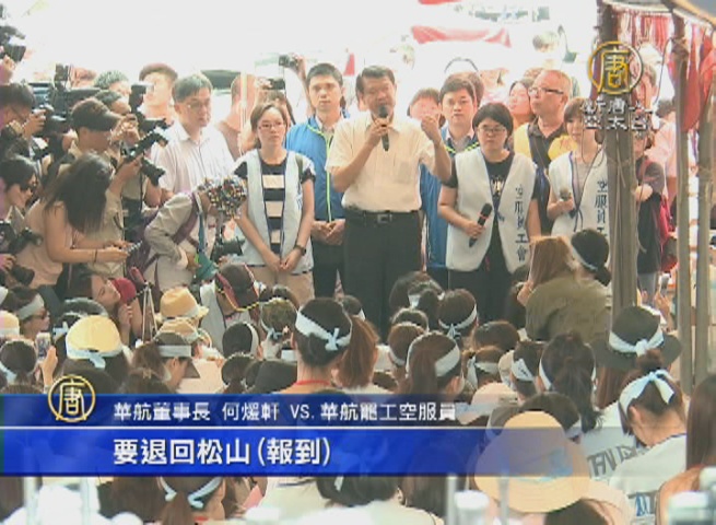 【新唐人亞太台 2016 年 06 月 24 日訊】新聞頭條先帶您關心,台灣史上首次合法罷工,中華航空空服員罷工活動持續,華航新董座何煖軒今天親自到罷工現場與空服員溝通,當場允諾,先恢復在松機報到。