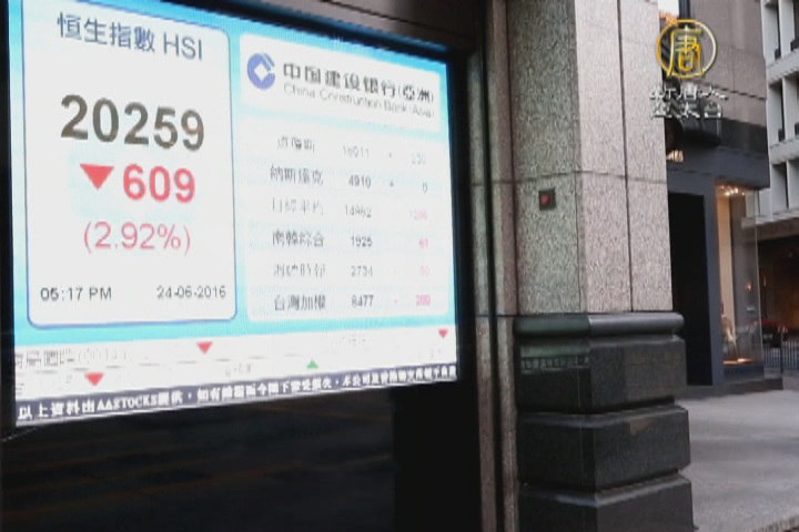 【新唐人亞太台 2016 年 06 月 26 日訊】英國以公投的方式選擇脫歐,消息也讓英鎊大跌到31年低位;亞股重創,香港恆生指數也一度跌超過1200點。香港金融管理局預計,未來一段時間將持續波動。請看我們香港記者的報導。