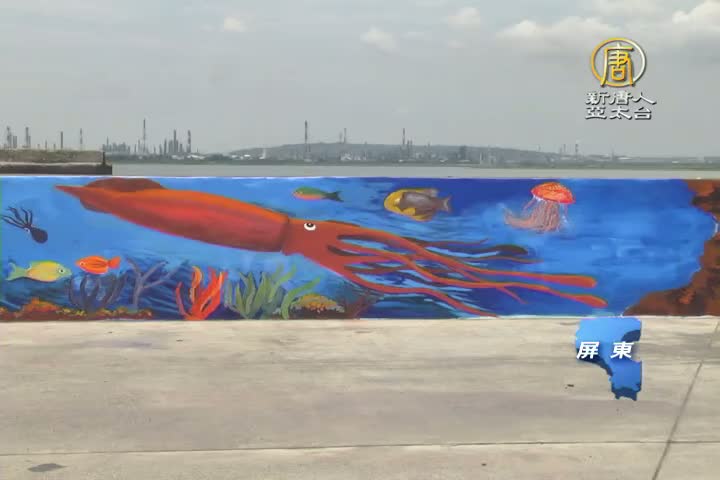 【新唐人亞太台 2016 年 06 月 27 日訊】屏東鹽埔港的海堤近期更換了新風貌,縣政府特別邀請屏東新園國中美術班的學生,在海堤畫上3D立體彩繪,美麗而生動的圖畫,也讓鹽埔港成為屏東的觀光新景點。