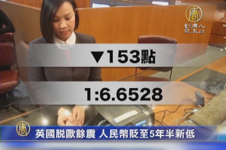 【新唐人亞太台 2016 年 06 月 29 日訊】英國脫歐公投後,英鎊大跌,超過一成。人民幣兌美元,也持續貶值,中間價來到五年半新低。有分析師預期,人民幣還會繼續下跌,請看我們香港記者的報導。